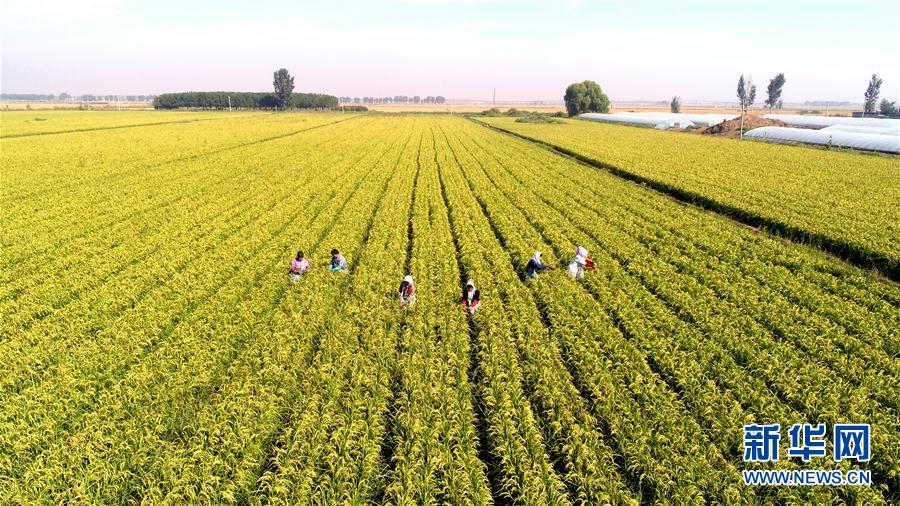 9月25日,河北省乐亭县古河乡李各庄村村民在稻田里去除杂草(无人机拍摄)。近年来,河北省乐亭县持续对境内盐碱地区域进行改良开发和有效利用,通过建设台田种植区、改善排水灌溉系统、引进培育抗盐碱农作物品种、发展滨海养殖业和“农家乐”“渔家乐”等乡村游项目,在昔日瘠薄的盐碱地上走出了一条绿色高效的现代农业发展和乡村振兴之路。新华社记者 牟宇 摄