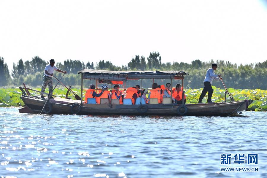 10月1日,游客乘船游览白洋淀景区。 当日是国庆长假第一天,河北雄安新区境内的白洋淀景区秋色宜人,吸引不少游客前来游玩。 新华社记者 李鑫 摄