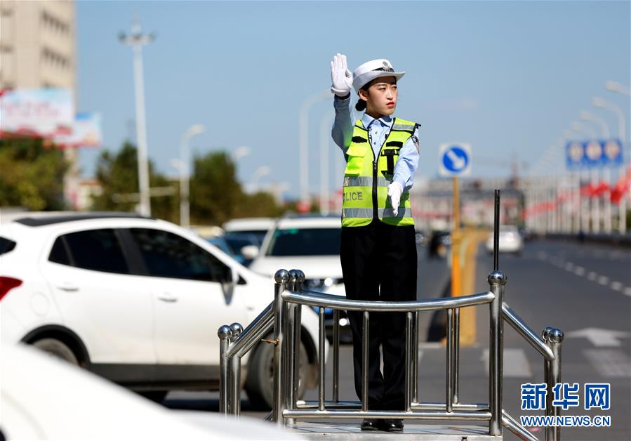 10月4日,河北省武安市公安交通警察大队城区中队民警在指挥交通。 国庆节期间,许多劳动者仍然坚守在工作一线,在岗位上度过节日。 新华社记者 王晓 摄