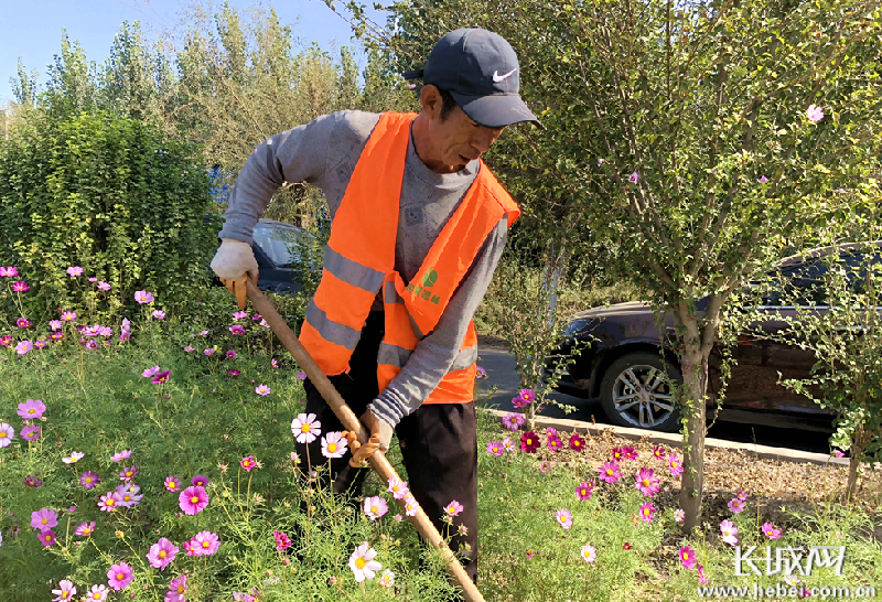 10月6日上午,在雄安新区雄县环村东路和杨西楼大街交叉口旁,一名园林工人正在清除道旁绿植中的杂草。霍少轩 摄