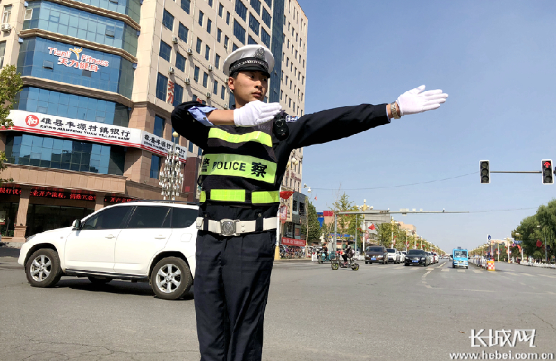 10月6日上午,在雄安新区雄县雄州路与文昌大街交叉口,一名交警在坚守岗位指挥交通。霍少轩 摄