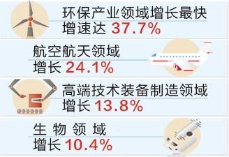 七大领域“六升一降”。在全省高新技术产业七大领域中,环保产业领域增长最快,增速达37.7%,高于高新技术产业增加值增速27.7个百分点;航空航天领域增长24.1%;高端技术装备制造领域增长13.8%;生物领域增长10.4%;电子信息领域增长9.6%;新材料领域增长8.3%;新能源领域下降3.3%。