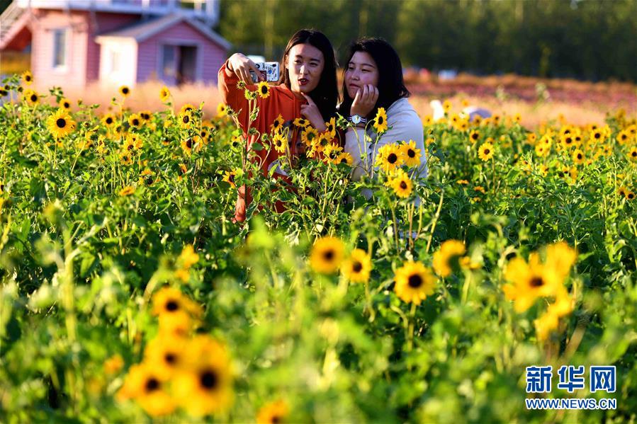 10月9日,在河北省石家庄市滹沱河畔的森林河趣那公园内,游客在花田观赏游览。
