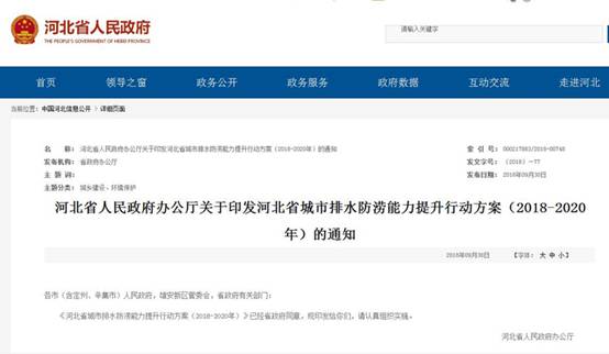 近日,河北省政府办公厅印发《河北省城市排水防涝能力提升行动方案(2018—2020年)》提出,按照大城市易涝点防涝能力达到30年一遇以上,中小城市达到20年一遇以上标准,通过采取排水管渠和排涝泵站提升、雨污分流管网改造、河道清淤清障、雨水源头减排等措施,全力开展城区易涝点综合整治。到2020年底,各市、县社会影响大的城市内涝积水区域基本消除,城市内涝防治体系基本完善,实现“小雨不积水,大雨不内涝”的治理目标,全省城市内涝防治水平显著提高。