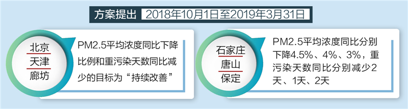 方案提出,2018年10月1日至2019年3月31日,北京、天津、廊坊市PM2.5平均浓度同比下降比例和重污染天数同比减少的目标为“持续改善”;石家庄、唐山、保定PM2.5平均浓度同比分别下降4.5%、4%、3%,重污染天数同比分别减少2天、1天、2天。