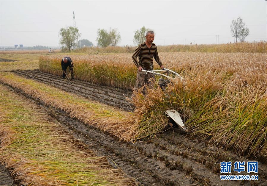 10月21日,农民在河北省昌黎县刘台庄镇收割水稻。 近日,河北省秦皇岛市水稻收获工作全面展开,标志着该省的秋粮收获工作接近尾声。据介绍,河北省今年秋粮播种面积达6314万亩。 新华社记者 杨世尧 摄