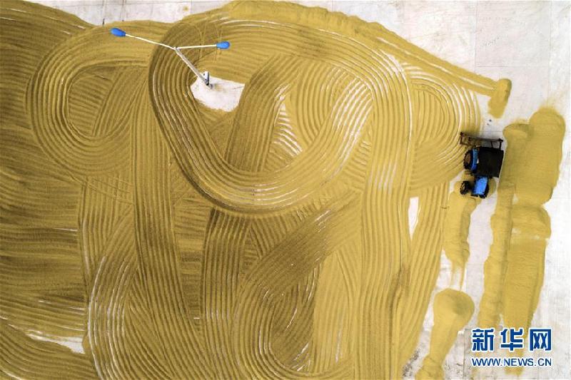 10月23日,在位于江苏淮安的白马湖农场,工人驾驶农机翻晒稻谷(无人机拍摄)。 新华社发(贺敬华 摄)