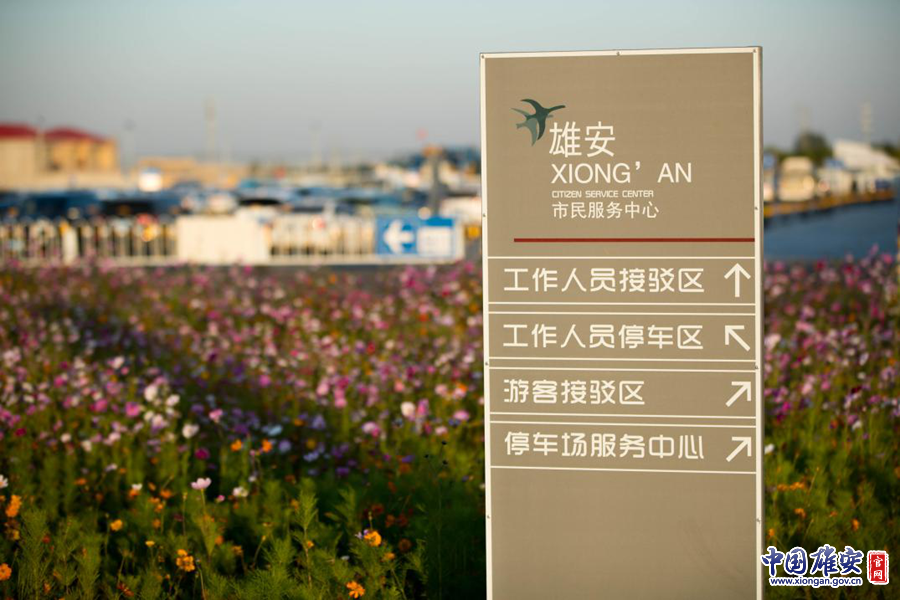 在鲜花的映衬下,雄安市民服务中心指示牌显得格外亮眼。中国雄安官网记者张斌 摄