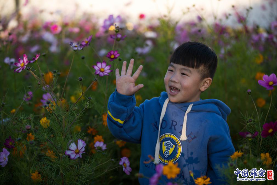雄安市民服务中心内,小游客与花海合影留念。中国雄安官网记者张斌 摄