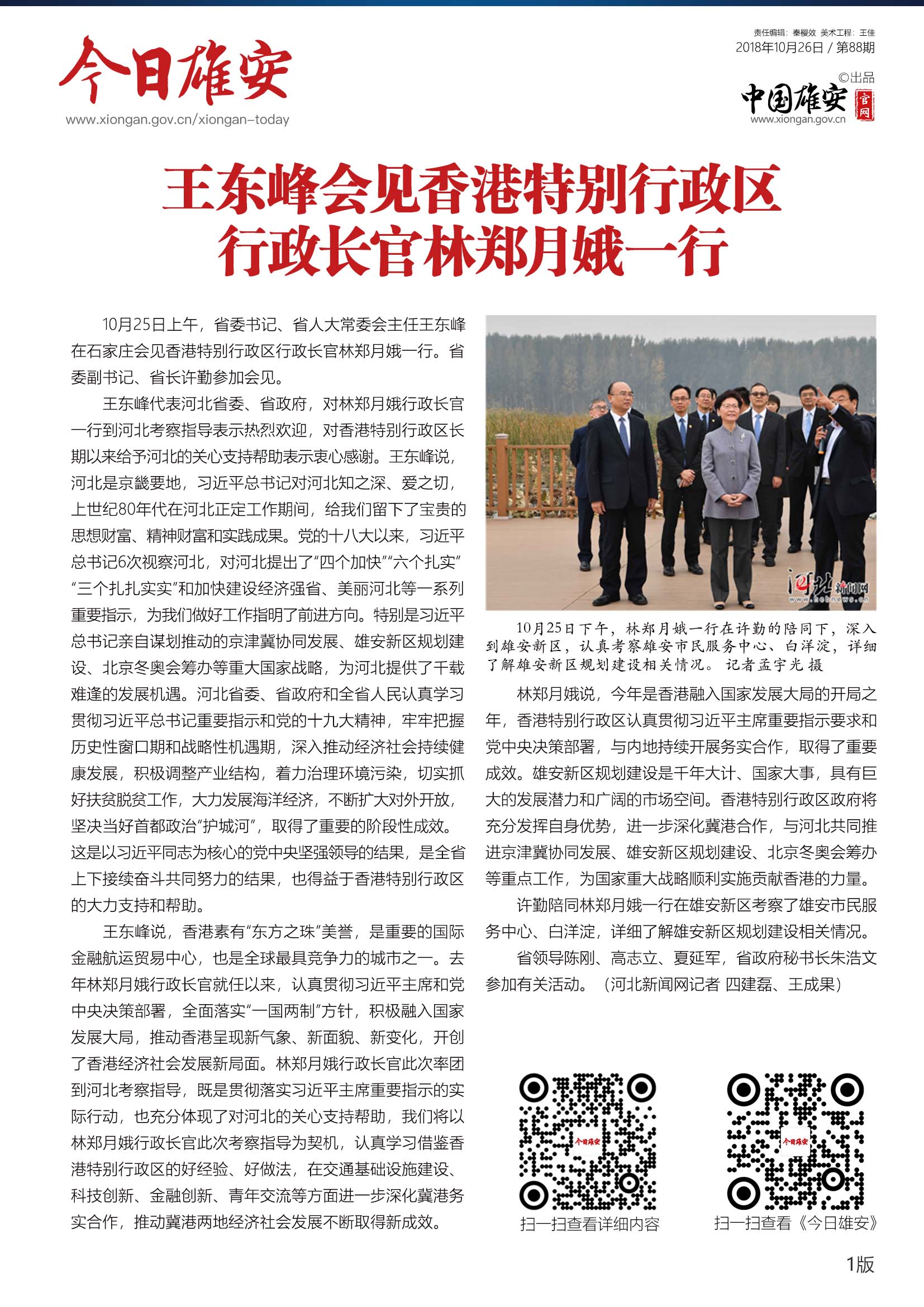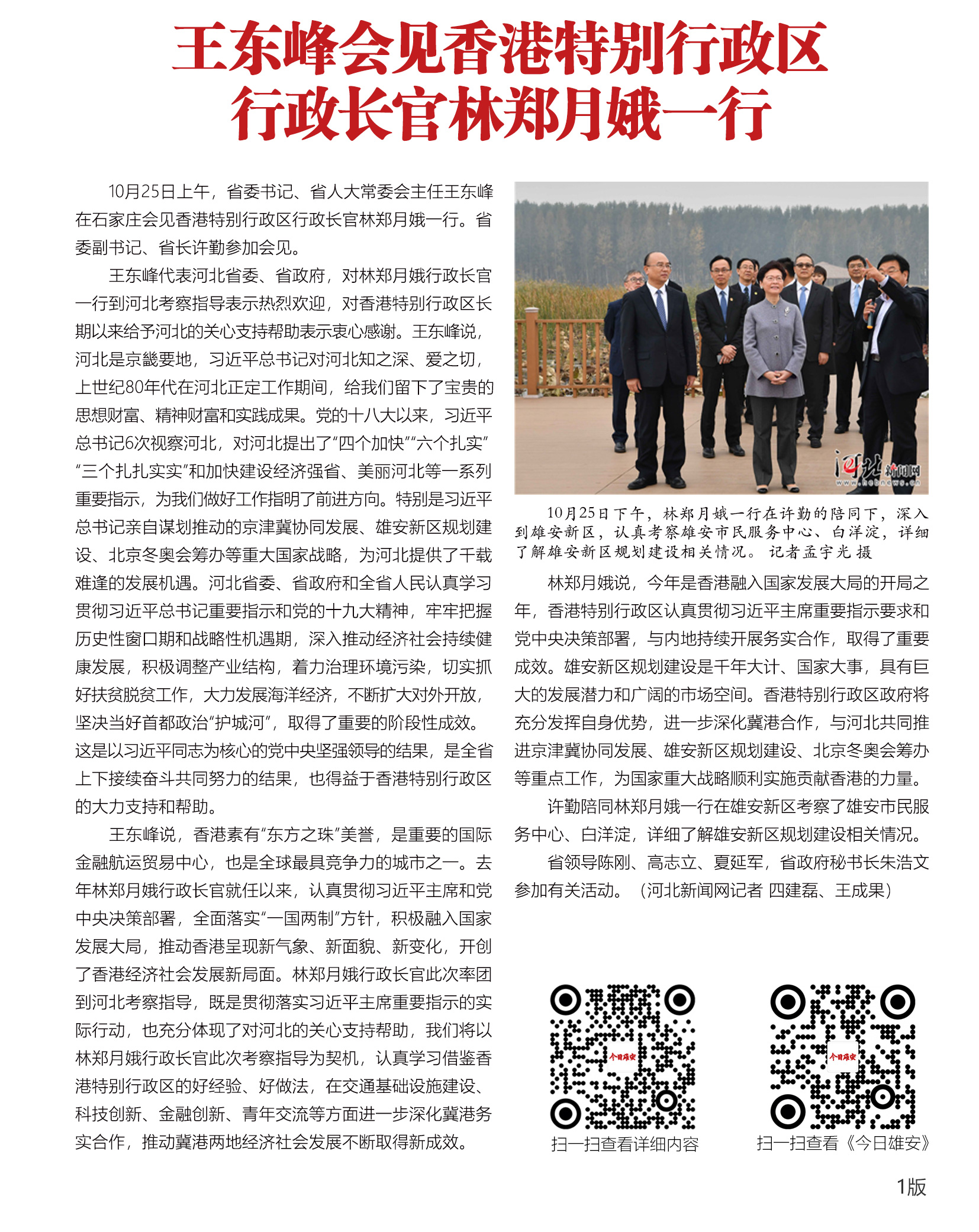 10月25日上午,省委书记、省人大常委会主任王东峰在石家庄会见香港特别行政区行政长官林郑月娥一行。省委副书记、省长许勤参加会见。