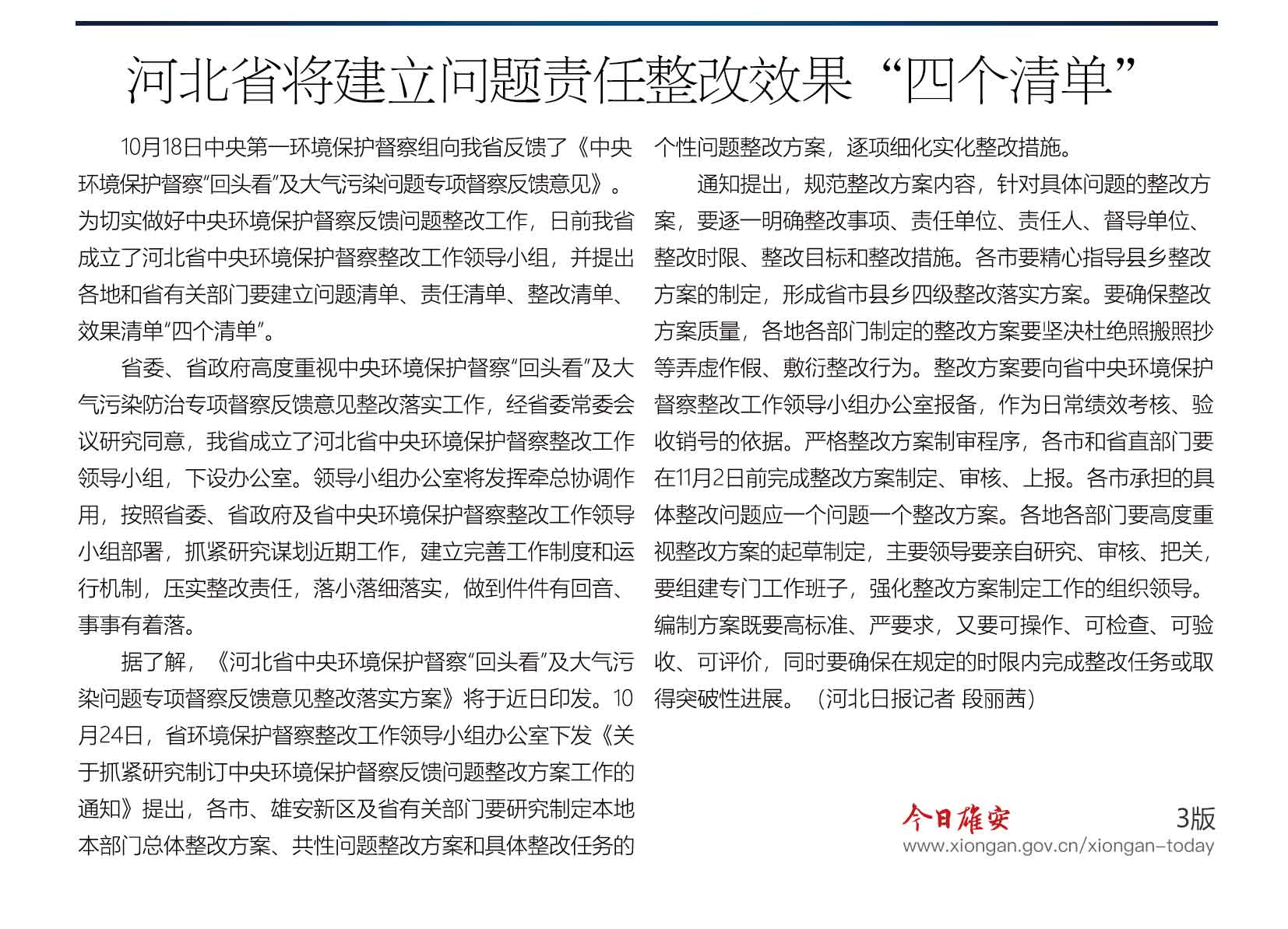 河北省将建立问题责任整改效果“四个清单”
