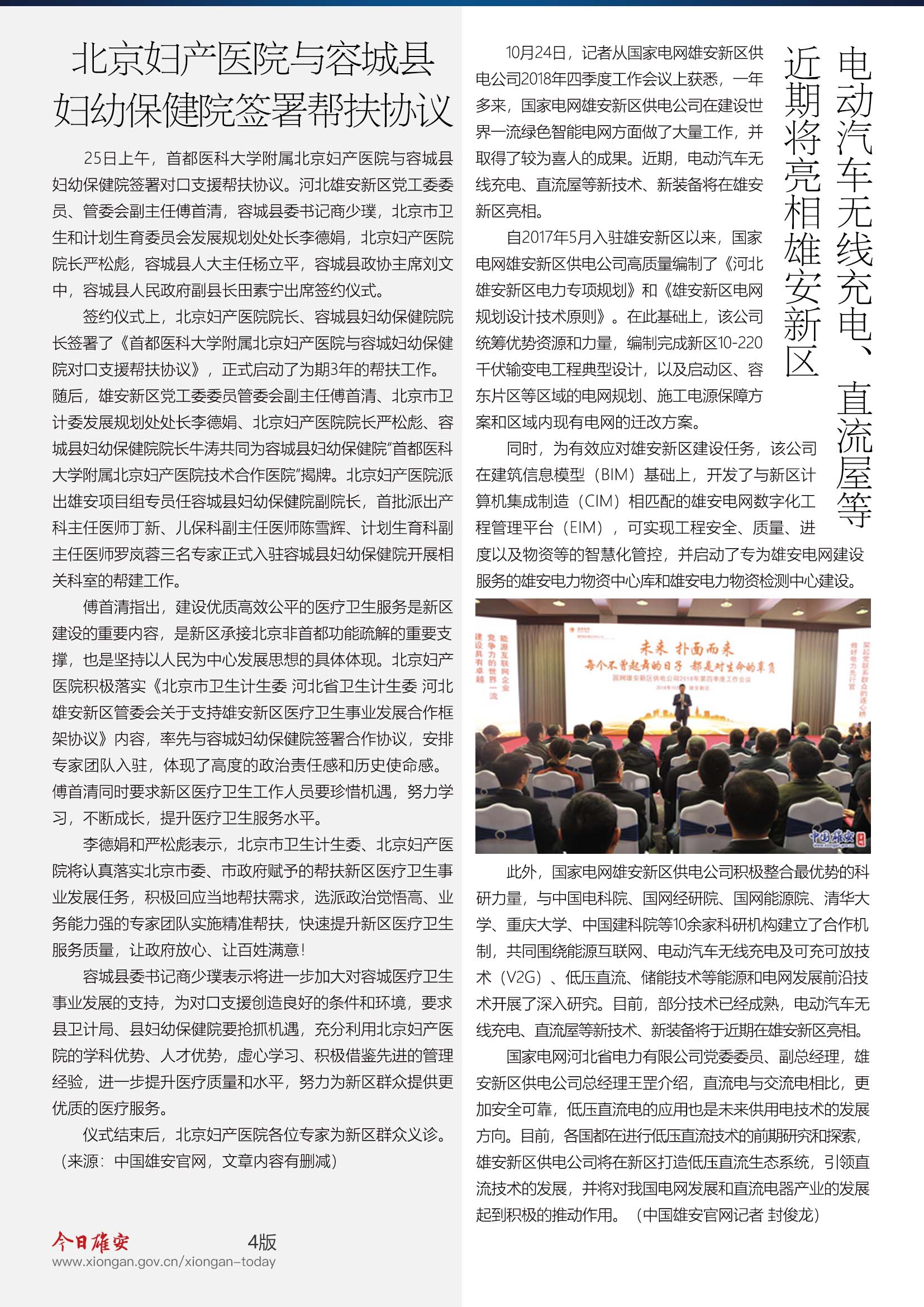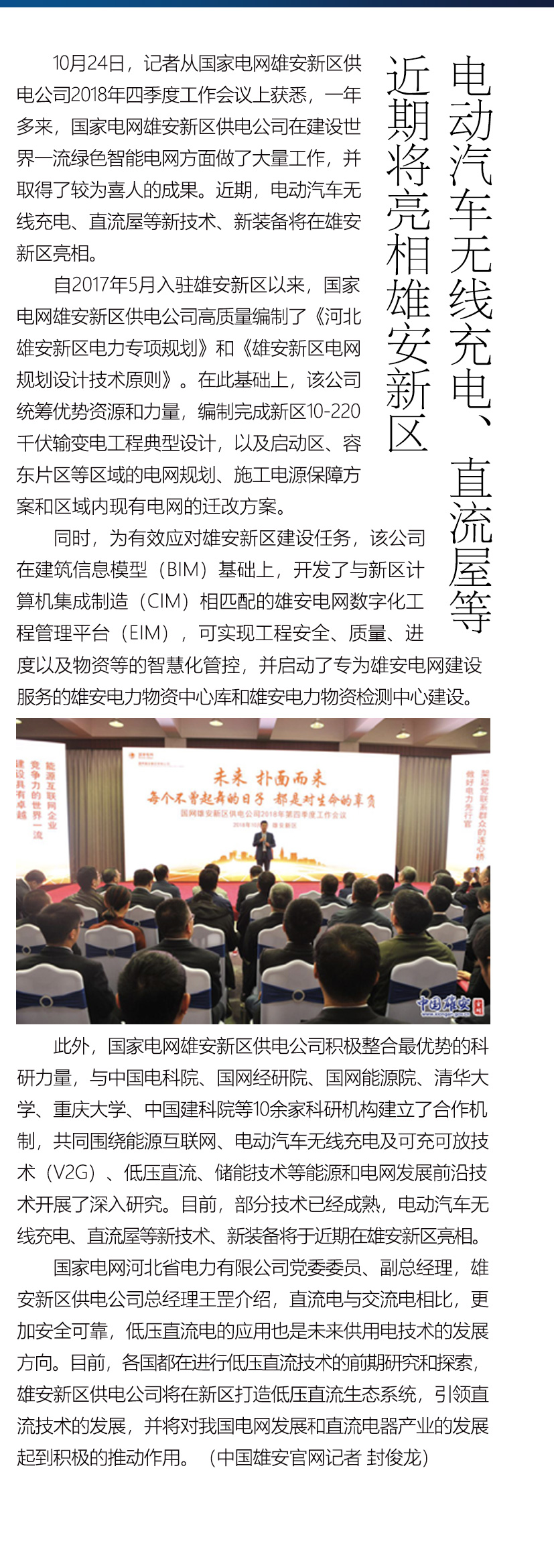 10月24日,记者从国家电网雄安新区供电公司2018年四季度工作会议上获悉,近期,电动汽车无线充电、直流屋等新技术、新装备将在雄安新区亮相。