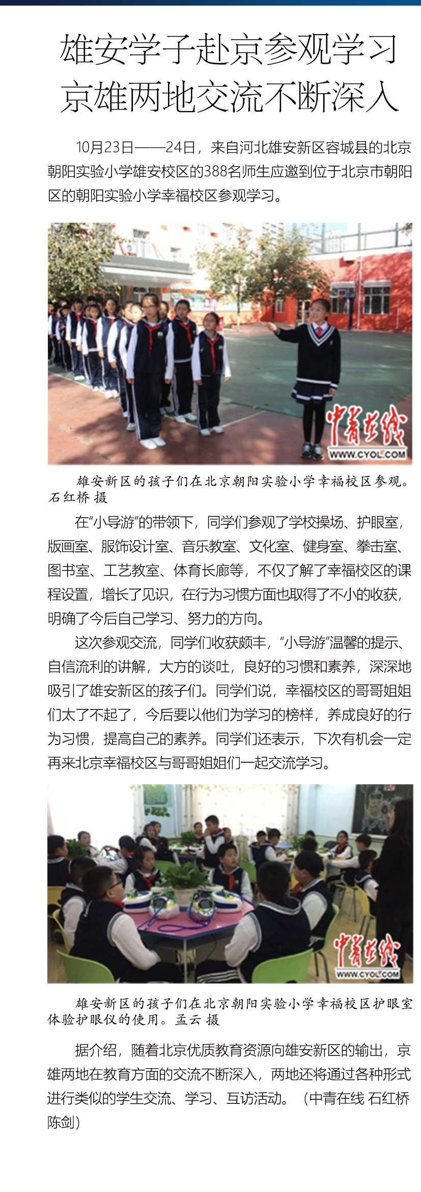 10月23日——24日,来自河北雄安新区容城县的北京朝阳实验小学雄安校区的388名师生应邀到位于北京市朝阳区的朝阳实验小学幸福校区参观学习。