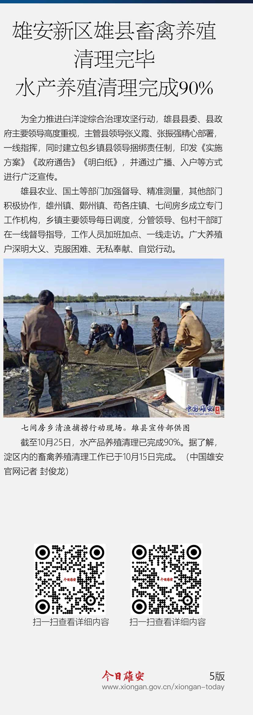 为全力推进白洋淀综合治理攻坚行动,雄县县委、县政府主要领导高度重视,截至10月25日,水产品养殖清理已完成90%。据了解,淀区内的畜禽养殖清理工作已于10月15日完成。
