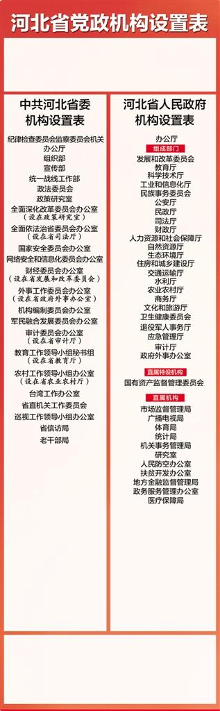 根据中共中央办公厅、国务院办公厅《关于印发〈河北省机构改革方案〉的通知》,我省共设置党政机构60个。