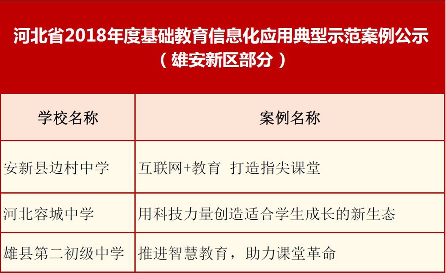 10月29日,河北省教育厅网站公布2018年度基础教育信息化应用典型示范案例,其中雄安新区三所学校的3个案例入选↓↓↓