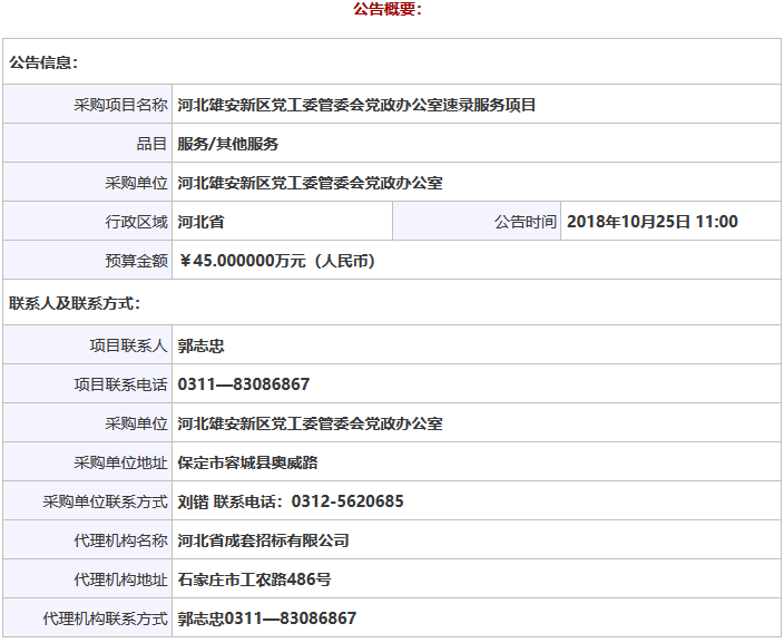 项目名称:河北雄安新区党工委管委会党政办公室速录服务项目
