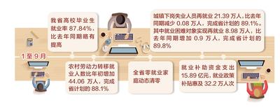 1至9月,我省高校毕业生就业率87.84%,比去年同期略有提高。城镇下岗失业人员再就业21.39万人,比去年同期减少0.08万人,完成省计划的89.1%。其中就业困难对象实现再就业8.98万人,比去年同期增加0.9万人,完成省计划的89.8%。农村劳动力转移就业人数比年初增加44.06万人,完成省计划的88.1%。全省零就业家庭动态清零。就业补助资金支出15.89亿元,就业政策补贴惠及32.2万人次。