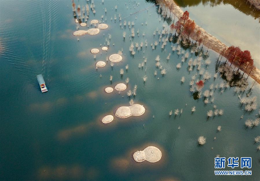 这是10月30日在安徽省宁国市方塘乡青龙湾水库拍摄的红杉林(无人机拍摄)。 深秋时节,安徽省宁国市方塘乡青龙湾水库2000余亩红杉林呈现出油画般的秋景。 新华社发(施亚磊 摄)