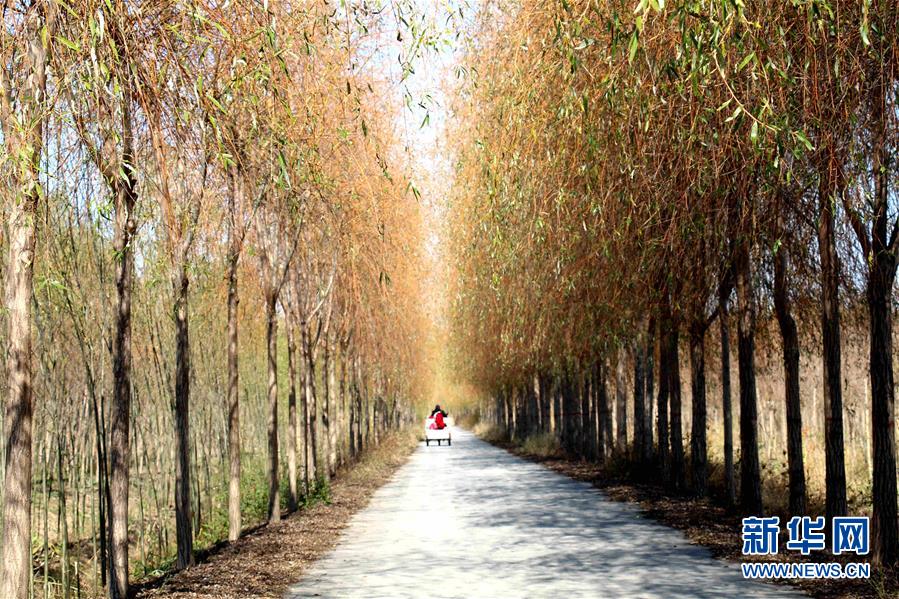 10月31日,村民在山东省滨州高新区乡间小道上经过。 眼下,我国各地秋意正浓,惹人陶醉。 新华社发(初宝瑞 摄)