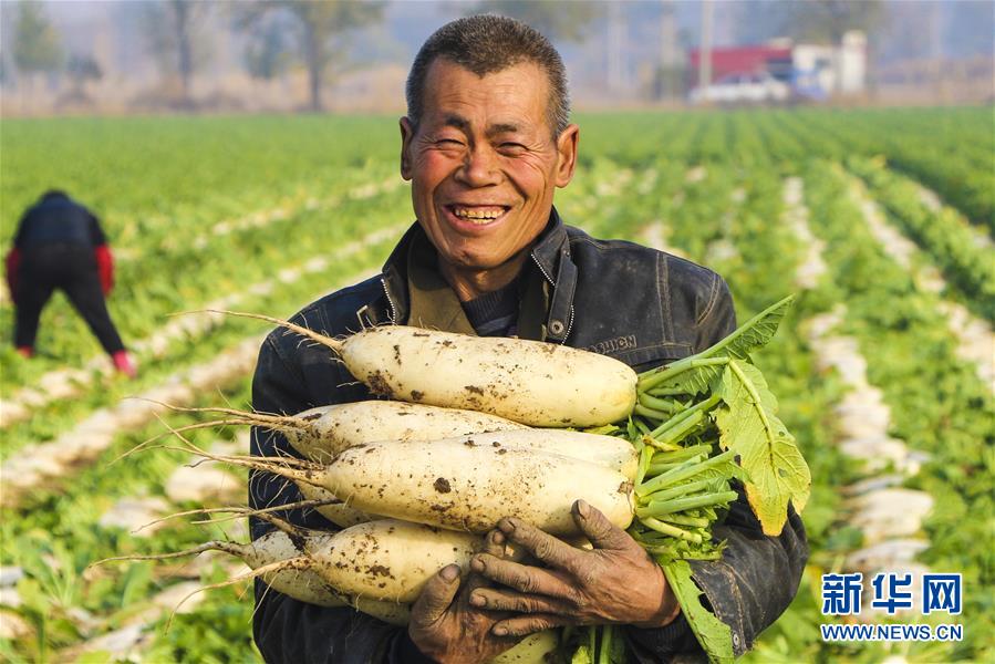 近年来,河北大城县在推进产业扶贫过程中,积极引导农民调整农业产业结构,让农民从规模化、集约化、市场化经营中增加收入。其中,该县万亩生态蔬菜基地种植白萝卜2000余亩,销往北京、天津以及南方多个城市,亩产值近万元,带动当地村民500余人就业,人均年收入达14000元。新华社记者 李晓果摄