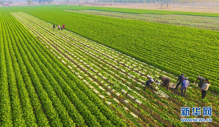 11月3日,大城县王香屯村秋丰种养殖农民专业合作社农民在收获白萝卜(无人机拍摄)。 新华社记者 李晓果摄