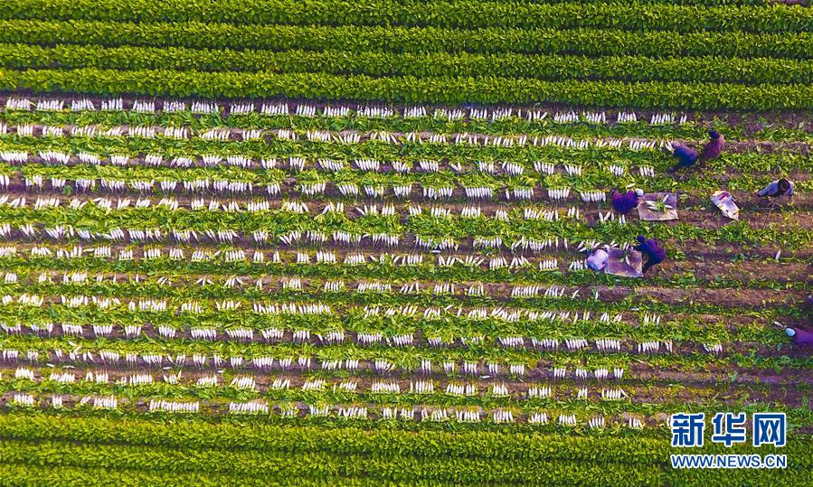 11月3日,大城县王香屯村秋丰种养殖农民专业合作社农民在收获白萝卜(无人机拍摄)。 新华社记者 李晓果摄