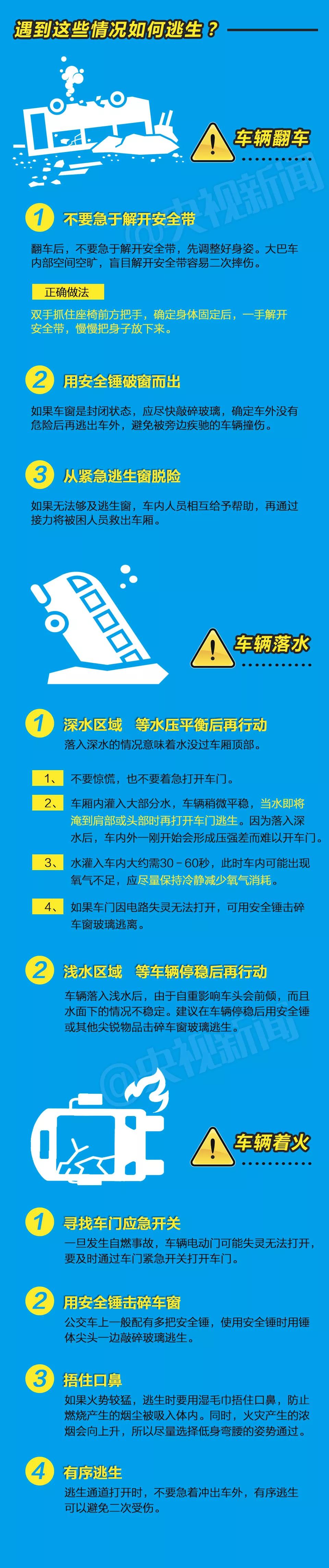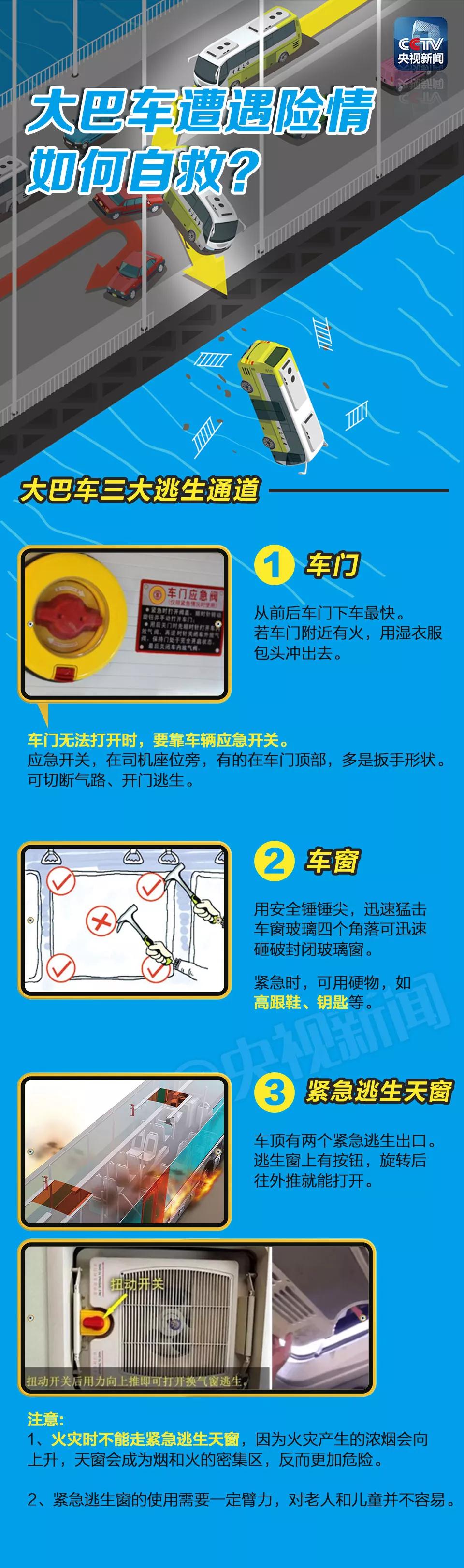乘坐公共交通时,哪些行为是要不得的?大巴车一旦发生落水、着火、翻车等紧急事故该如何自救?大巴车有哪些逃生通道?安全锤、车门应急阀、逃生天窗该怎样使用?但愿用不到,一定要知道↓