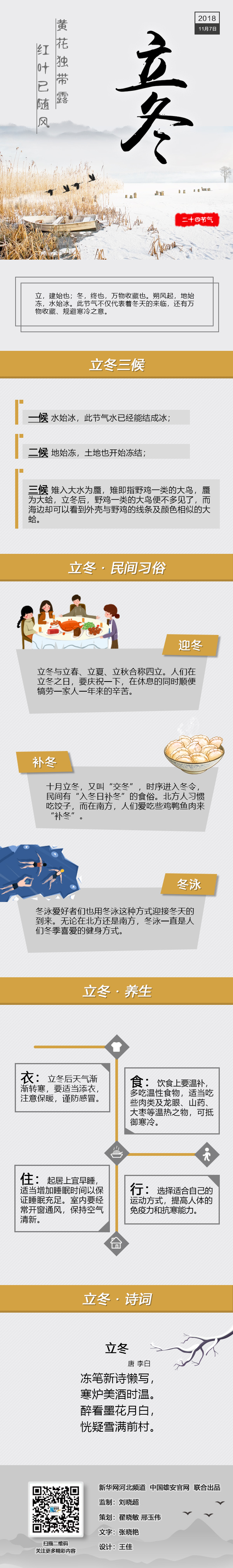 立,建始也;冬,终也,万物收藏也。朔风起,地始冻,水始冰。此节气不仅代表着冬天的来临,还有万物收藏、规避寒冷之意。