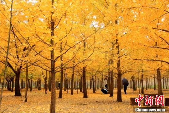 11月6日,连绵细雨中,第六届邳州银杏节暨第二届国际银杏峰会在江苏邳州举办。当天,邳州50万亩银杏林海同步进入童话世界,如同金色梦幻之海。满树的绿叶变成金黄,在细雨的“亲吻”下,落下片片黄叶,如同织成了金色的地毯一般。据了解,近年来,邳州依托当地银杏大规模种植资源,实施“银杏旅游+”战略,年吸引国内外游客数百万人次,成为乡村振兴的重要引擎。王鹏 摄