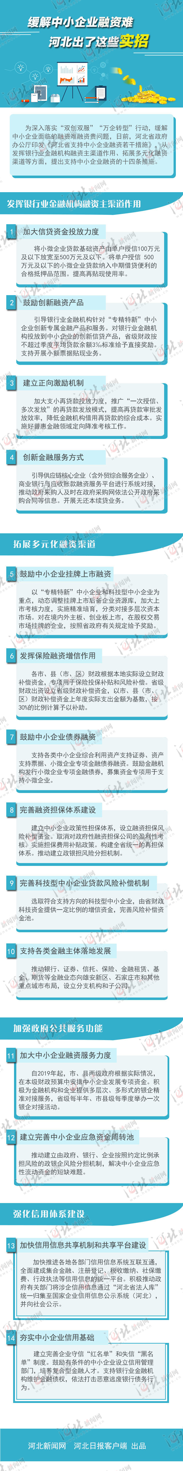 为深入落实“双创双服”“万企转型”行动,缓解中小企业面临的融资难融资贵问题,日前,河北省政府办公厅印发《河北省支持中小企业融资若干措施》,从发挥银行业金融机构融资主渠道作用、拓展多元化融资渠道等方面,提出支持中小企业融资的十四条措施。