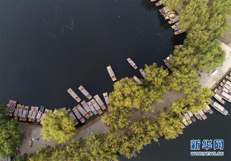 11月14日,游船停靠在白洋淀景区码头(无人机拍摄)。初冬时节,位于河北雄安新区境内的白洋淀景区景色秀美、环境宜人。新华社发(柴更利 摄)