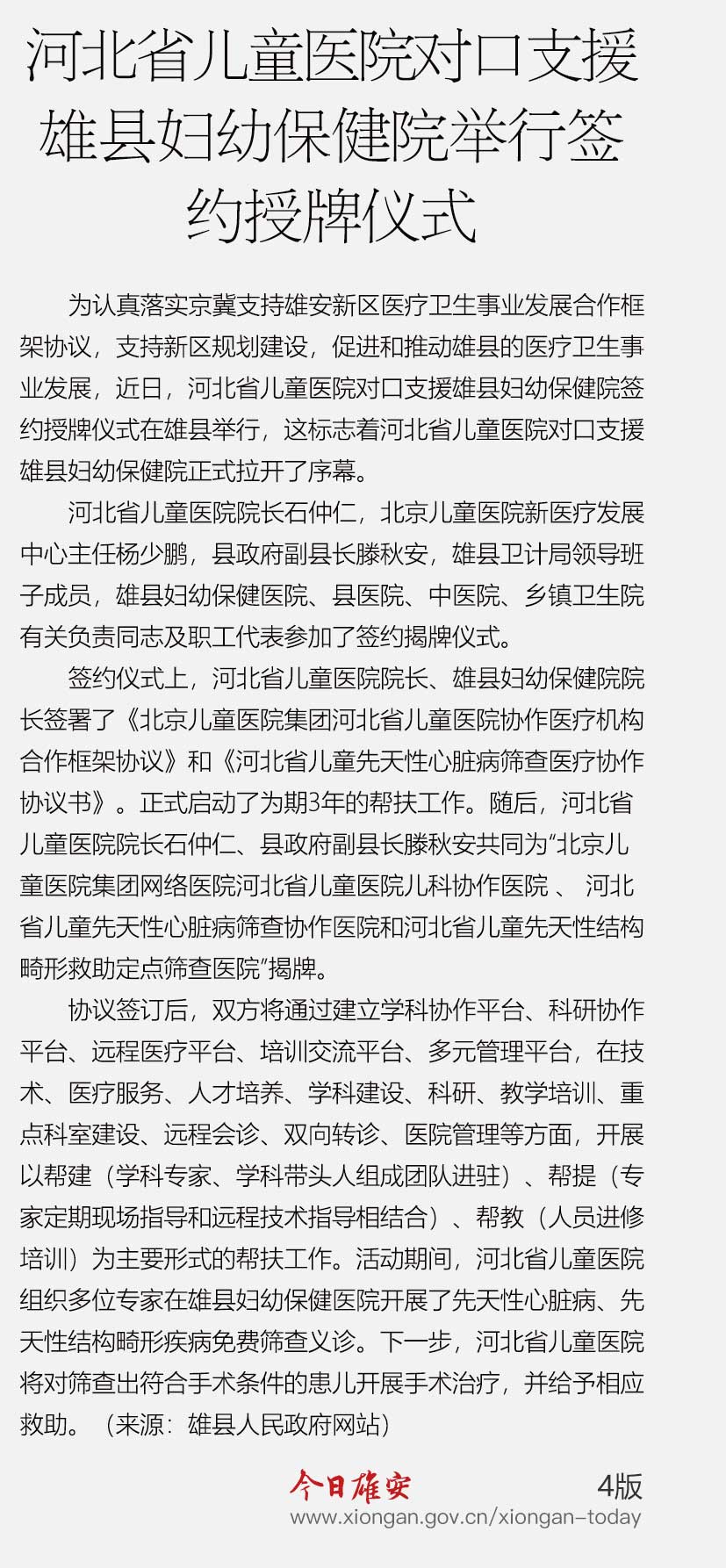 近日,河北省儿童医院对口支援雄县妇幼保健院签约授牌仪式在雄县隆重举行,这标志着河北省儿童医院对口支援雄县妇幼保健院正式拉开了序幕。