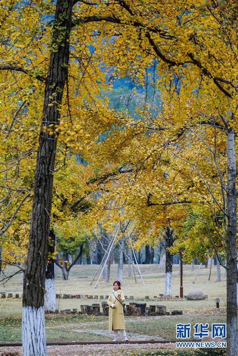 11月16日,游客在银杏林中游玩。近日,在浙江省长兴县小浦镇,“十里银杏长廊”和近千亩花海经过近一年的升级改造后,以崭新的面貌与游客见面。花海、观光小火车、古村民宿、银杏长廊等旅游项目全面提升了小浦镇乡村旅游的品质。新华社记者 何璐璐 摄