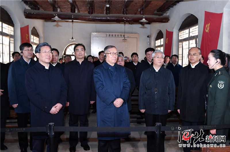 天津市党政代表团先后参观考察了雄安新区市民服务中心,石家庄市正定县塔元庄村、正定南城门和荣国府、石家庄国际会展中心,西柏坡纪念馆和中共中央旧址,并向五大书记像敬献花篮。