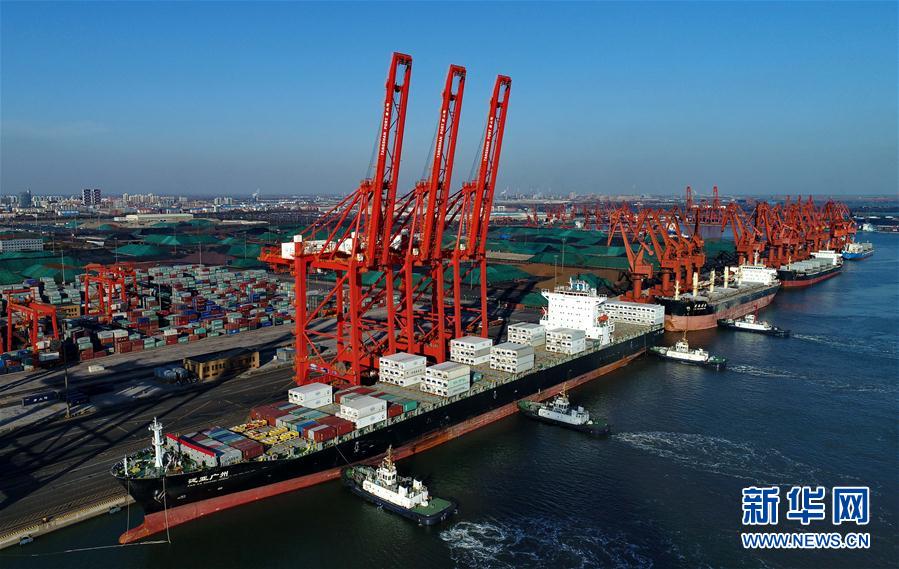 一艘轮船(左)向唐山港京唐港区集装箱码头靠泊(11月12日无人机拍摄)。记者从河北省交通运输厅港航管理局获悉,今年1至10月,河北省港口集装箱“水铁”联运吞吐量达19.16万标箱,超额完成了全年17万标箱的目标任务。新华社记者杨世尧摄