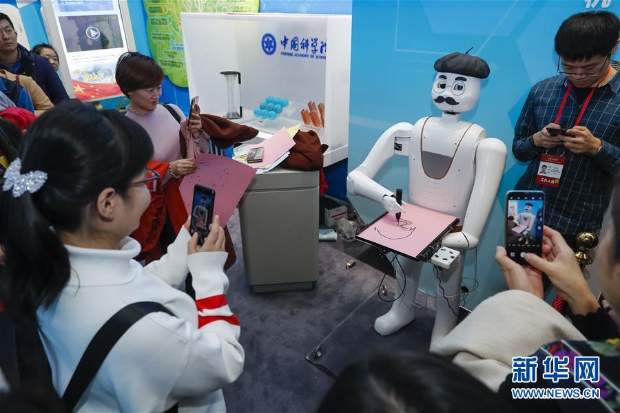 11月20日,在“伟大的变革——庆祝改革开放40周年大型展览”的大国气象展区,智能画像机器人“大千”在为一名观众画头像,吸引众多观众围观。“大千”采用了人脸识别技术,画一幅头像大约需要3至5分钟。 新华社记者沈伯韩摄