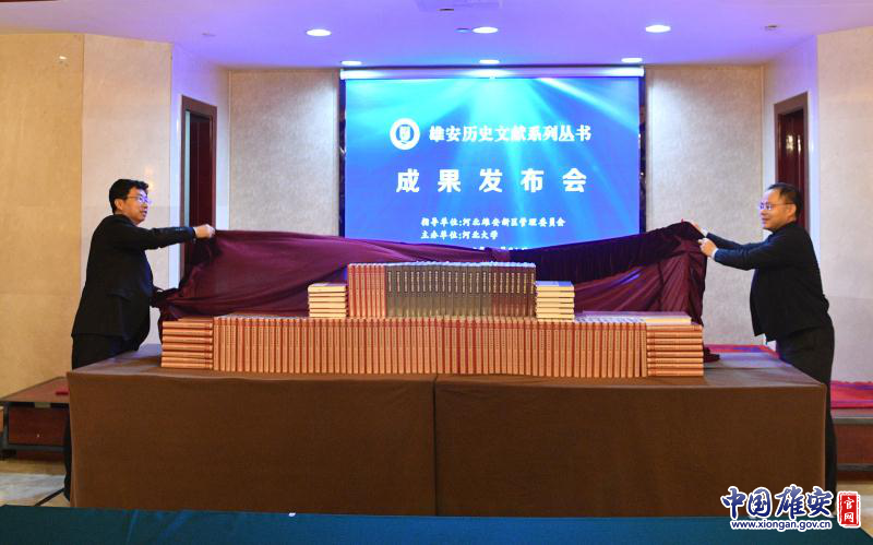雄安新区管委会副主任梁远、河北大学党委书记郭健共同为《雄安历史文献系列丛书》揭幕。河北大学党委宣传部供图