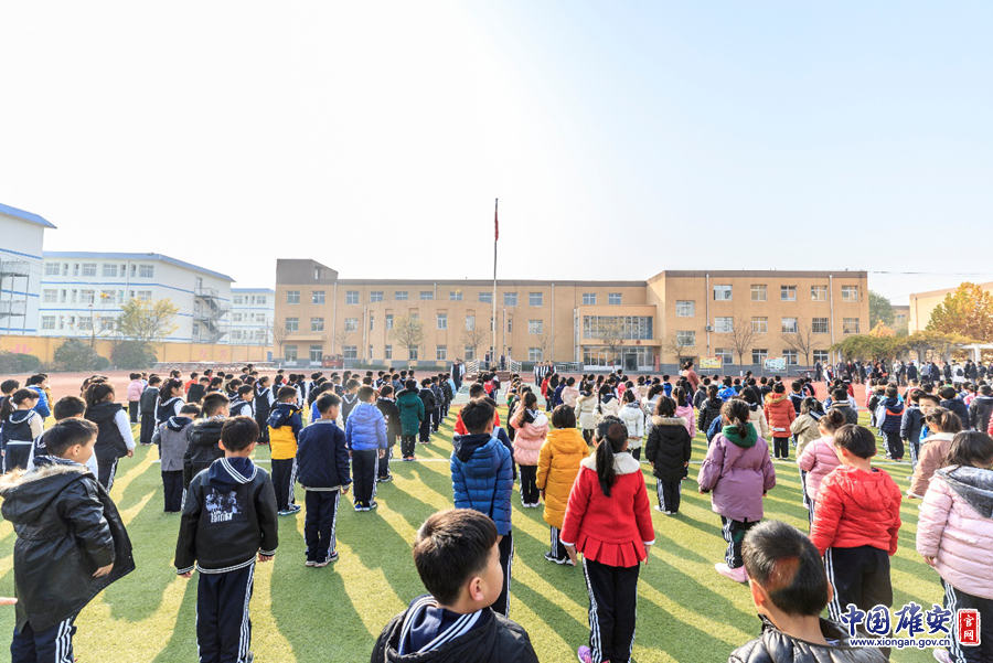 清晨的阳光照耀在每一个孩子的身上,这是北京市朝阳区实验小学分校的升旗仪式,只不过地点并不在北京,而是在雄安新区。实习生李鑫 摄