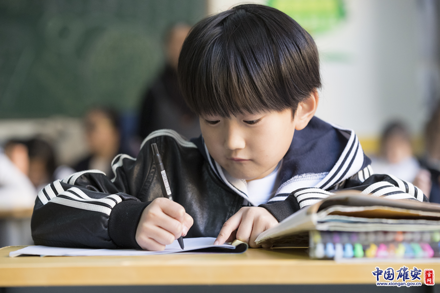 课堂上,一名小学生正在认真学习。今年,北京市朝阳区实验小学总校已经组织了雄安校区学生700余人次到北京校区进行参观学习。未来雄安校区的学生都能享受到与总校同步的教育资源。实习生郭家豪 摄