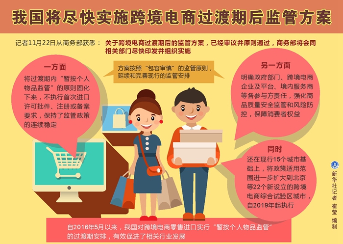 新华社北京11月22日电(记者于佳欣)记者22日从商务部获悉,关于跨境电商过渡期后的监管方案,已经审议并原则通过,商务部将会同相关部门尽快印发并组织实施。