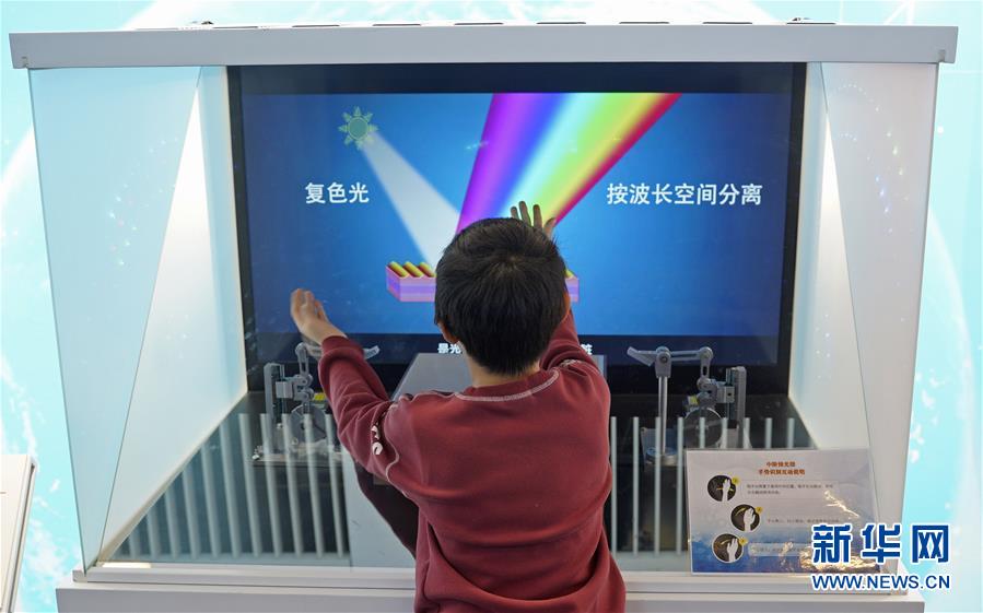 11月22日,一名小朋友与中阶梯光栅进行手势识别互动。“伟大的变革——庆祝改革开放40周年大型展览”目前正在中国国家博物馆举行,展览上的各种科技创新展示与互动吸引众多参观者。新华社记者 才扬 摄
