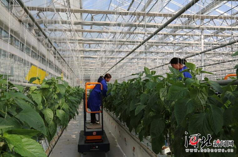 工人在南和县现代化设施农业产业基地温室大棚内为彩椒疏花。(资料片) 通讯员武国栋摄