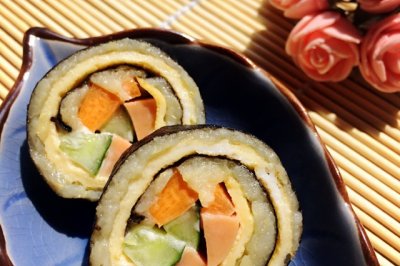 3.取出用海苔包好切片食用。