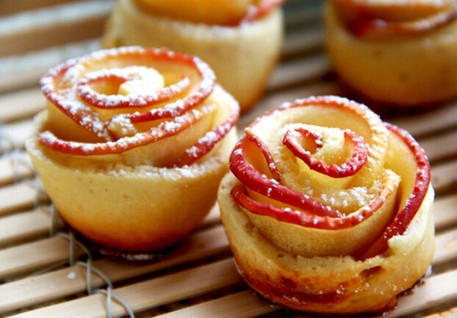3、把玫瑰苹果放入可定型的小模具中,放到烤箱中烘焙15分钟即可出炉。