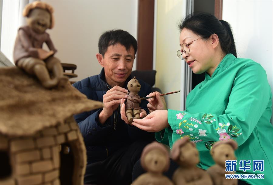 11月25日,泥塑艺人王龙岗(左)、陈淑珍在创作泥塑作品。