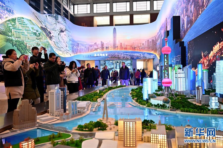 观众在“伟大的变革——庆祝改革开放40周年大型展览”上观看上海浦东陆家嘴实景沙盘(11月14日摄)。 新华社记者 李鑫 摄
