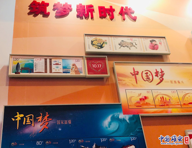 位于筑梦新时代部分的展柜展示了《河北雄安新区设立纪念》《图说我们的价值观》《扶贫日》《京津冀协同发展》《长江经济带》等邮票。2017年12月22日中国邮政发行的《河北雄安新区设立纪念》邮票1套2枚,面值均为1.20元。