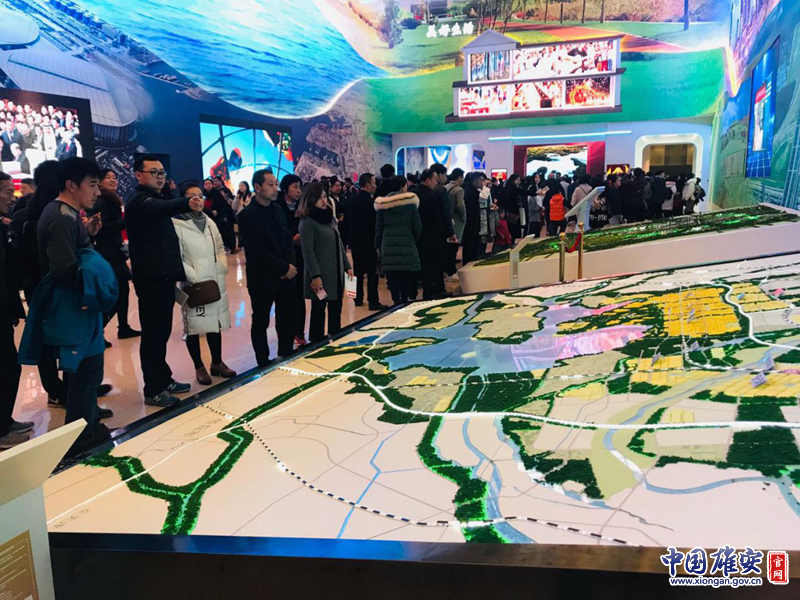 河北雄安新区规划沙盘吸引大批观众驻足欣赏,他们有的盯着沙盘静静地思考,有的忍不住向同行的人进行一番“独到”的讲解。中国雄安官网记者李晏 摄