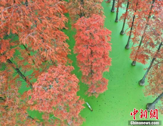 2018年12月1日,初冬季节,武汉新洲区涨渡湖湿地数千棵水杉树叶红似火,令人心旷神怡,宛如童话仙境。图为12月1日涨渡湖湿地秋色斑斓,如同画布。